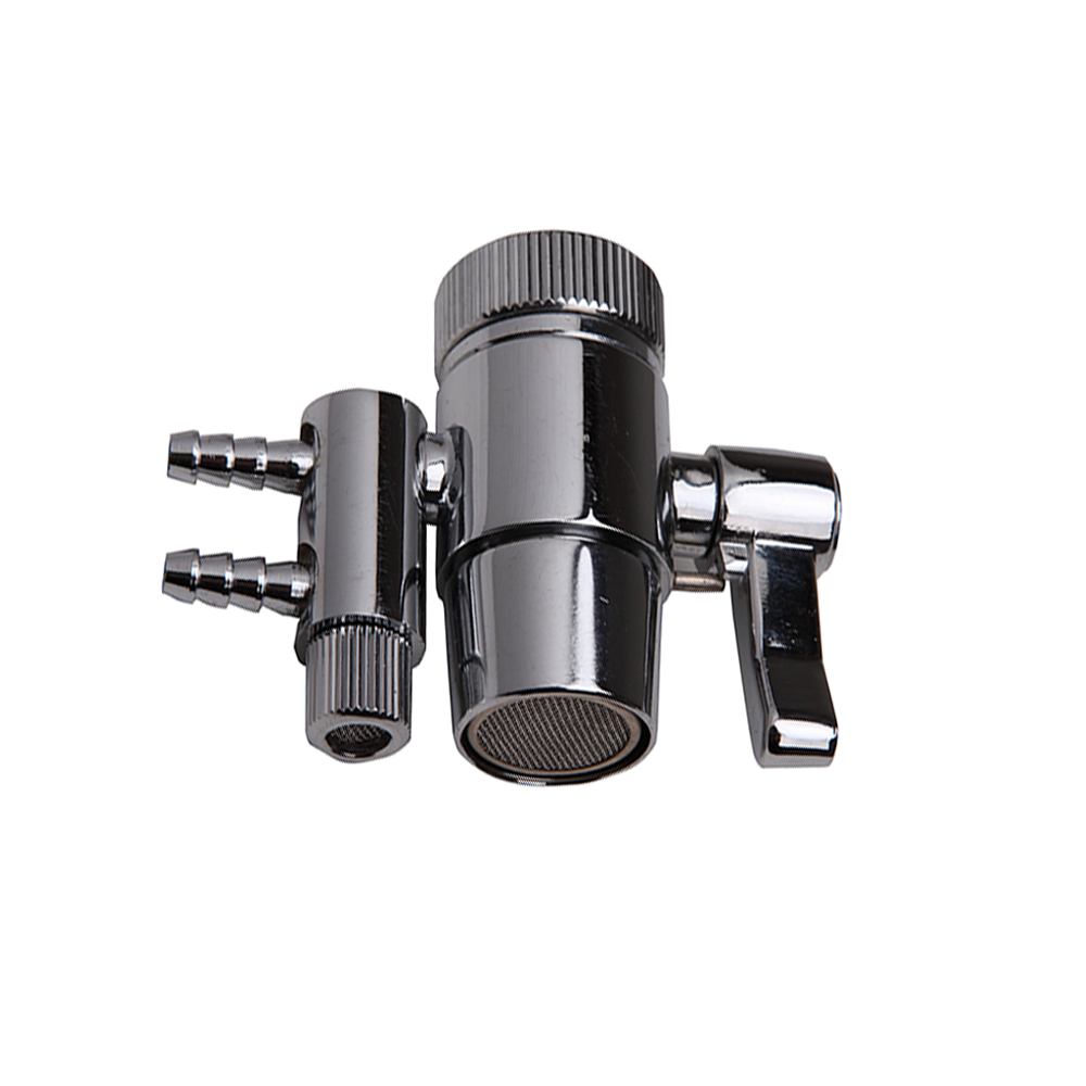 Advanced Dual-Line Filtration Connection The F080-F05 2-Way Diverter Valve is a specialized plumbing component engineered for water filtration systems that require both a supply and a return line, such as countertop Reverse Osmosis (RO) units or water ionizers. Featuring a dual-barb (2x2) configuration, this valve efficiently routes tap water to your filter while simultaneously directing bypass or wastewater back into the sink. The "Without Nut" (W-O Nut) design ensures a straightforward, push-on connection for standard 1/4 inch flexible tubing. Constructed from heavy-duty brass with a high-polish chrome finish, it delivers a leak-proof, highly durable, and aesthetic solution for your kitchen.
