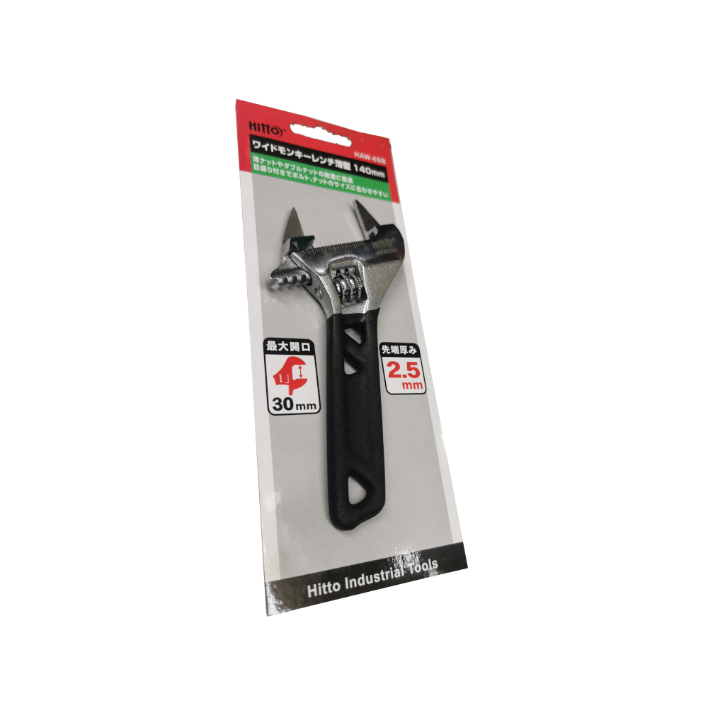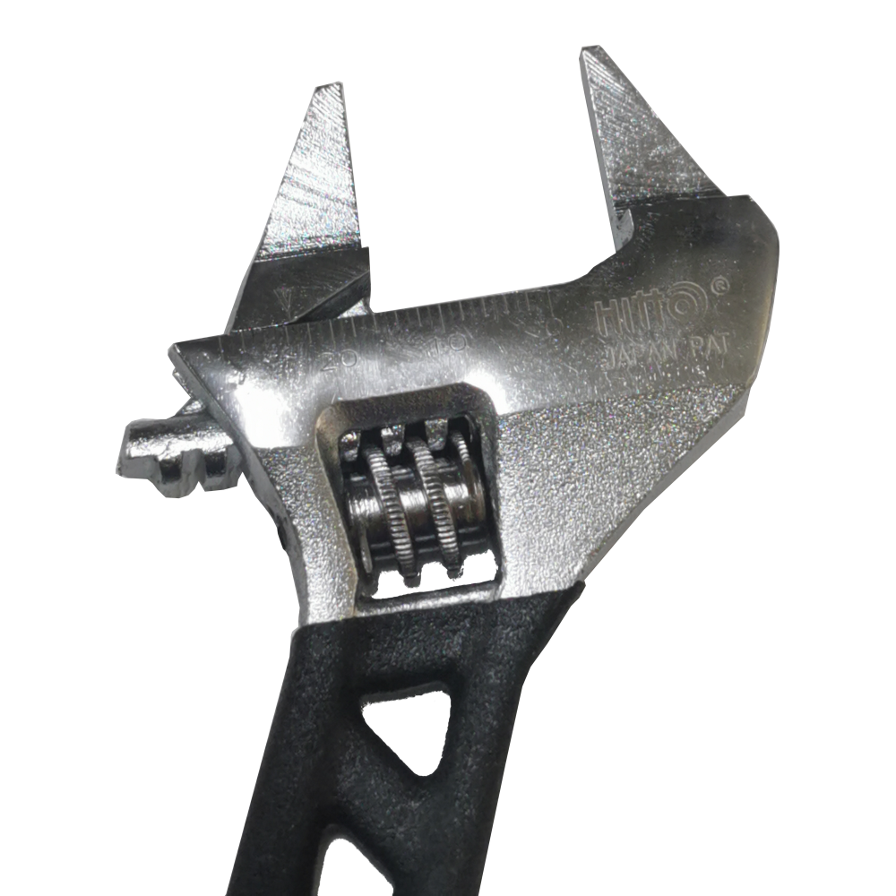 The HITTO HAW-6SB is a heavy-duty, stubby adjustable wrench designed to offer high capacity and access in confined spaces. Despite its compact, 6-inch (140mm) length, this wrench provides a significantly wider jaw opening than standard wrenches of the same size, making it a versatile tool for professional mechanics, plumbers, and maintenance workers.