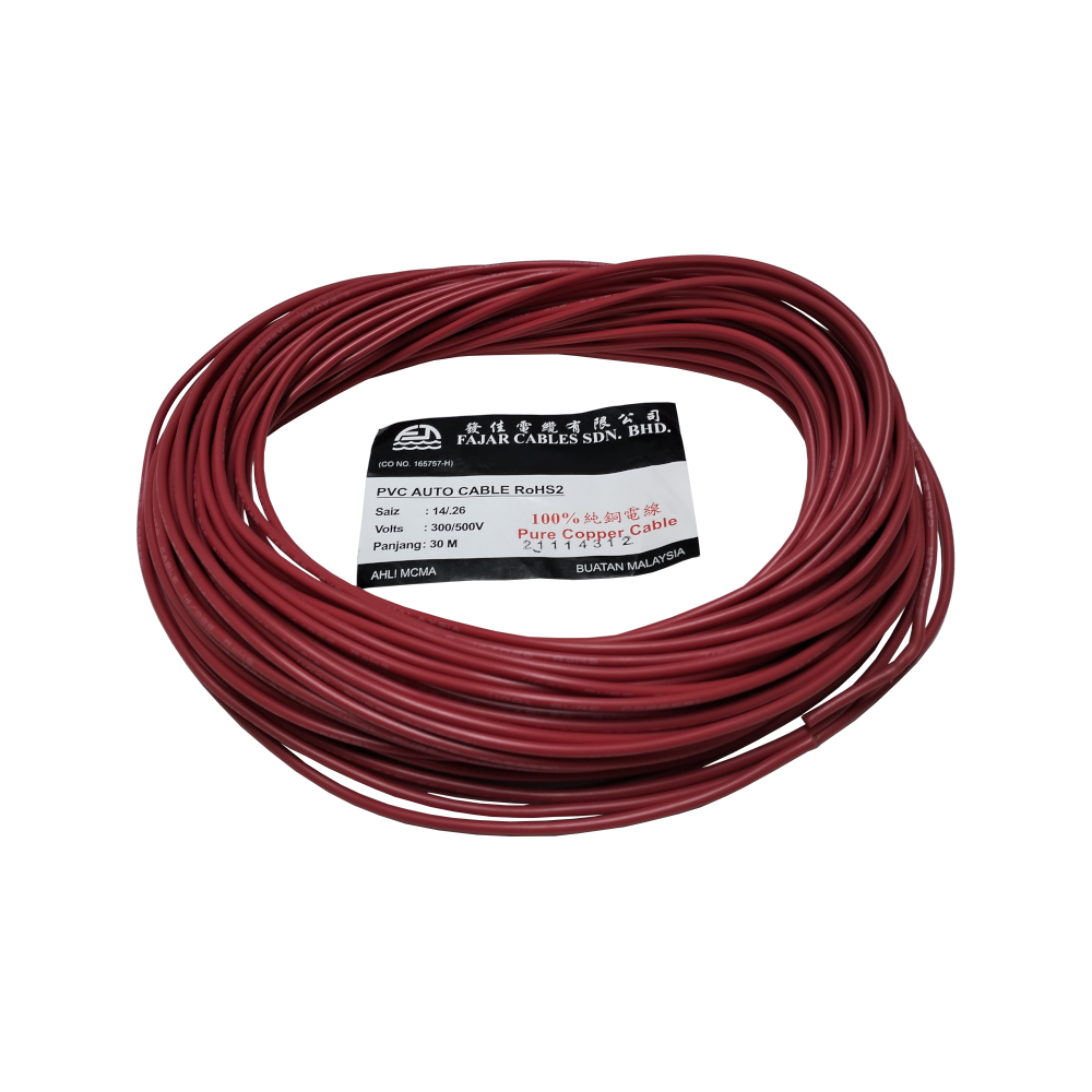 The Fajar 14/0.26 is a high-quality, single-core automotive cable manufactured in Malaysia by Fajar Cables. It is specifically designed for low-voltage applications in vehicles and machinery, featuring 100% pure annealed copper for superior conductivity and heat resistance.